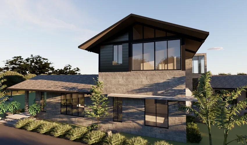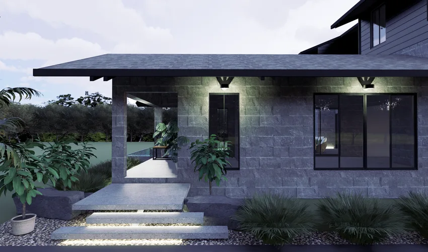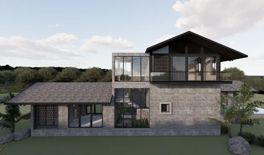 Behold a bungalow that appears to defy gravity, with the steel structure hovering gracefully above the solid stone foundation, symbolizing freedom and liberation, while grounded in the timeless strength of natural materials.